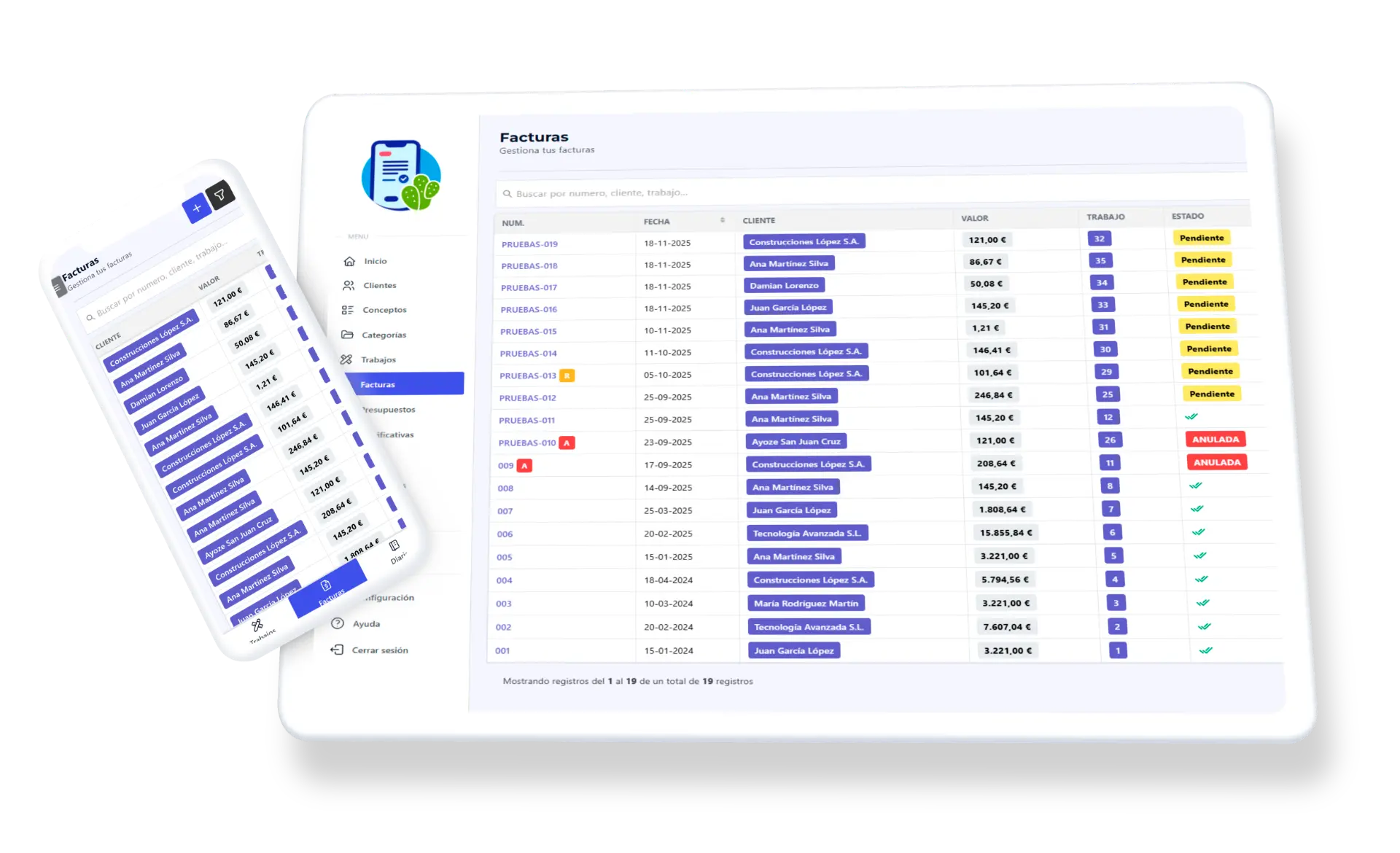 Facturas, clientes, trabajos, presupuestos, diario de gastos y estadísticas. Todo lo que un autónomo o micropyme necesita.